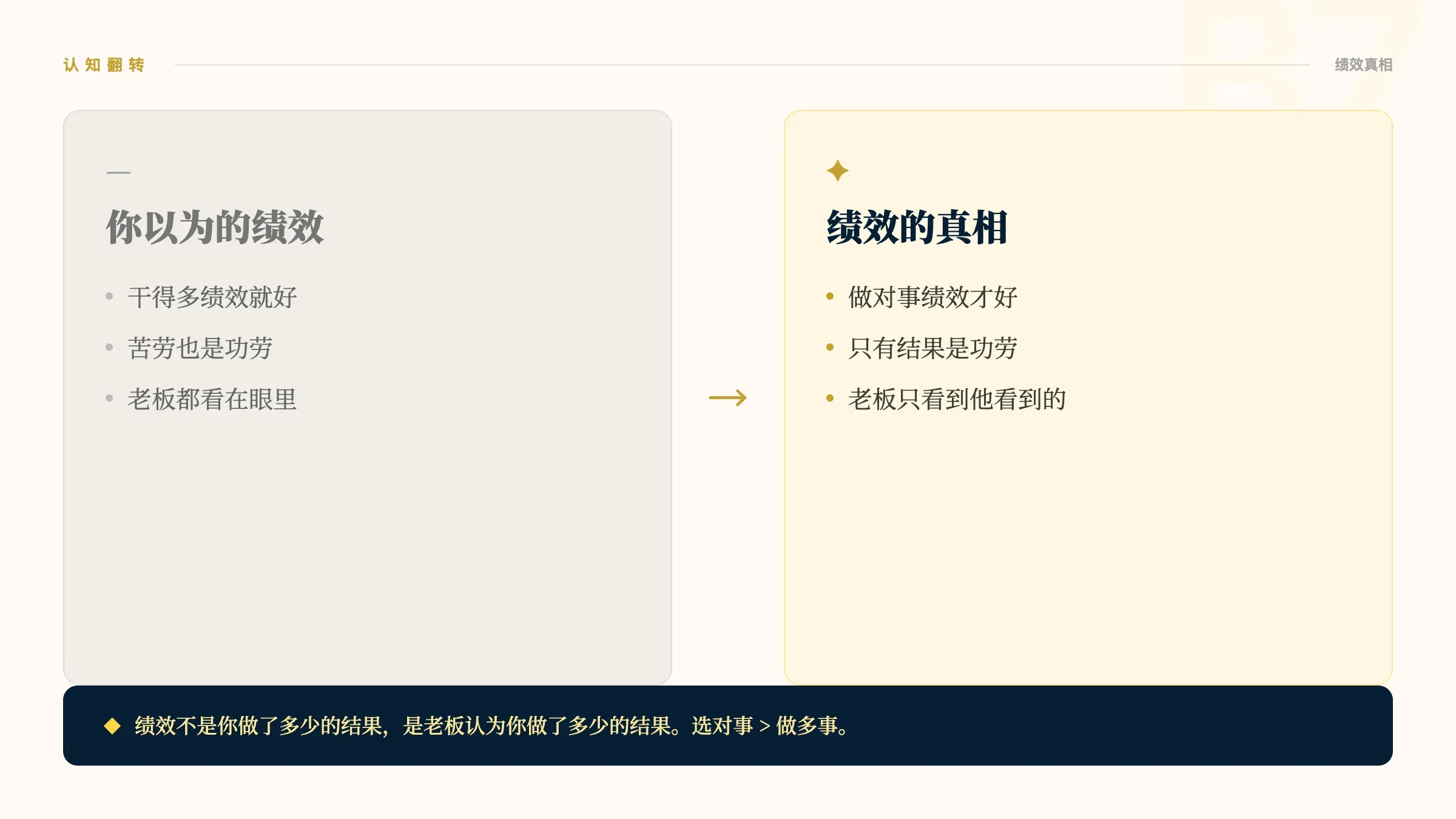 核心洞察:绩效不是你做了多少,是老板认为你做了多少注意,这不是说你要学会”表演”。而是说你要学会”选对事做”——做那些重要的、和组织目标对齐的、能产生业务结果的事。干了很多绩效不好,根因往往不是你不努力,而是你的努力方向不对。(让别人”看见”你的成果同样重要,这部分我们在B9详细讲。)